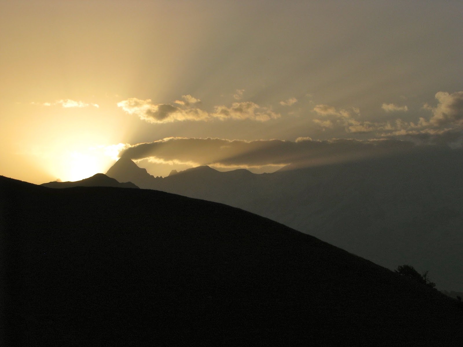 Again I woke up well before sunrise and went out of the tent and sat on a rock for some time waiting for sun to rise. Naveen presented hot bed tea which was exemplary in this cold morning. Arjun too woke up and came out. He climbed the hill on the west to get a good view of the sun. He cajoled me to come up which I did and what a view I got. The sun was peeking out hugging side of a peak. There was a streak of cloud on the peak going away from it glowing in the sun. The railfan in me immediately conjured up image of steam engine belching grey smoke through chimney. We sat there in silence looking at the spectacle.